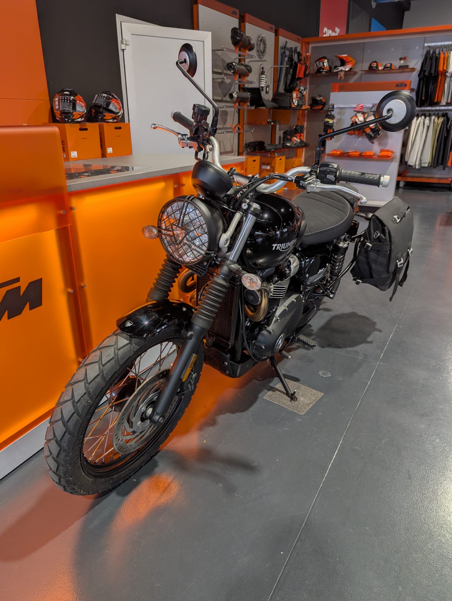Triumph Street Scrambler 900 in ottime condizioni con borsa laterale e coprifaro.